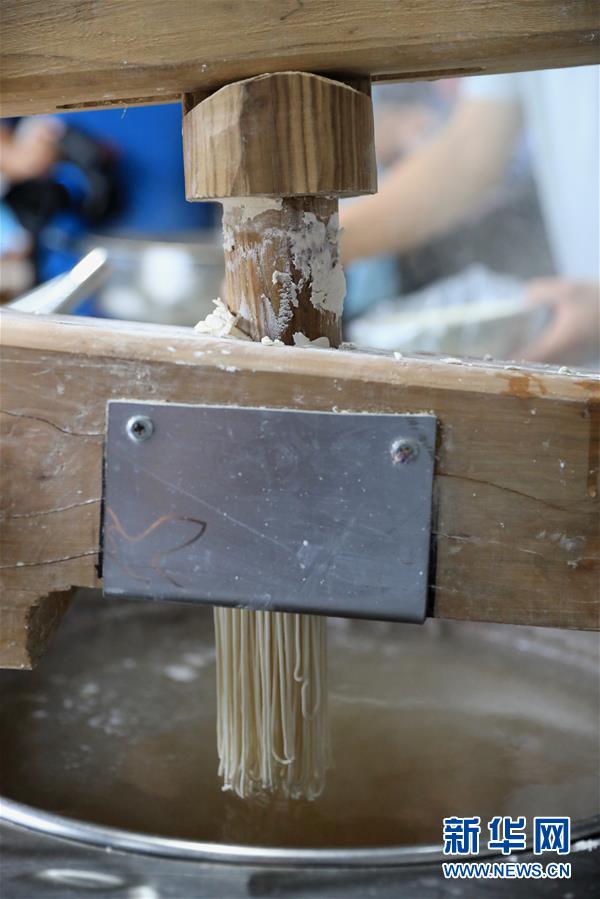 8月30日,在石家庄市鹿泉区德明古镇,无极饸饹非遗传承人袁建鸿制作饸饹面。 新华社发(梁子栋 摄)