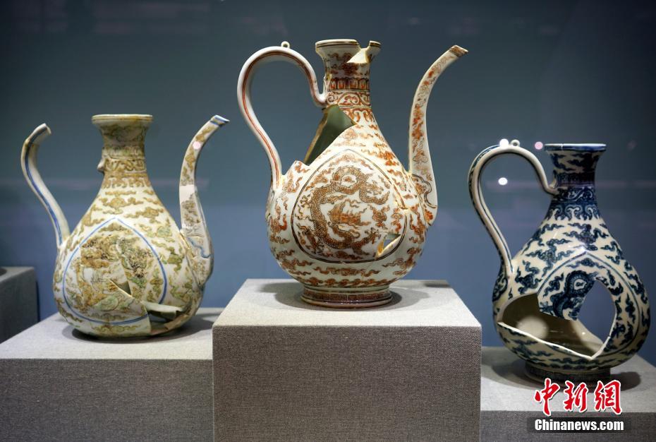 8月31日,“填空补白II——考古新发现明正统、景泰、天顺御窑瓷器”展览在香港中文大学文物馆开幕。是次展览精选景德镇御窑博物馆珍藏的158件(套)御窑瓷器,这些展品主要是2014年考古新发现的明代正统、景泰、天顺年间的御窑瓷器(片),不仅有厚重巨作,又不乏轻盈巧制。这些瓷器的发现填补了传统上对明代御窑瓷器的认知,证明正统、景泰、天顺年间景德镇御窑生产不仅没有停滞,更持续进行探索,充满活力。图为2014年考古发现的明朝正统至天顺年间的御窑瓷器“云龙纹杏叶壶”。中新社记者 张炜 摄