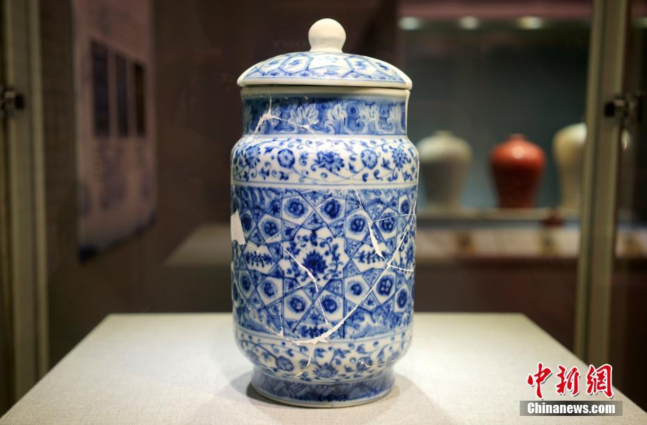 8月31日,“填空补白II——考古新发现明正统、景泰、天顺御窑瓷器”展览在香港中文大学文物馆开幕。是次展览精选景德镇御窑博物馆珍藏的158件(套)御窑瓷器,这些展品主要是2014年考古新发现的明代正统、景泰、天顺年间的御窑瓷器(片),不仅有厚重巨作,又不乏轻盈巧制。这些瓷器的发现填补了传统上对明代御窑瓷器的认知,证明正统、景泰、天顺年间景德镇御窑生产不仅没有停滞,更持续进行探索,充满活力。图为2014年考古发现的明朝正统至天顺年间的御窑瓷器“青花花卉纹壮罐”。中新社记者 张炜 摄
