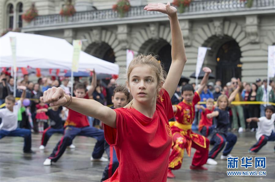 9月1日,在瑞士伯尔尼市中心的联邦广场,当地青少年进行武术表演。 当日,一场名为“遇见中国”的大型中国文化宣传推广活动在伯尔尼市中心的联邦广场举行,来自中国的舞龙、武术、民乐、书法等精彩表演让瑞士民众近距离感受中华文化的魅力。 新华社记者 徐金泉 摄