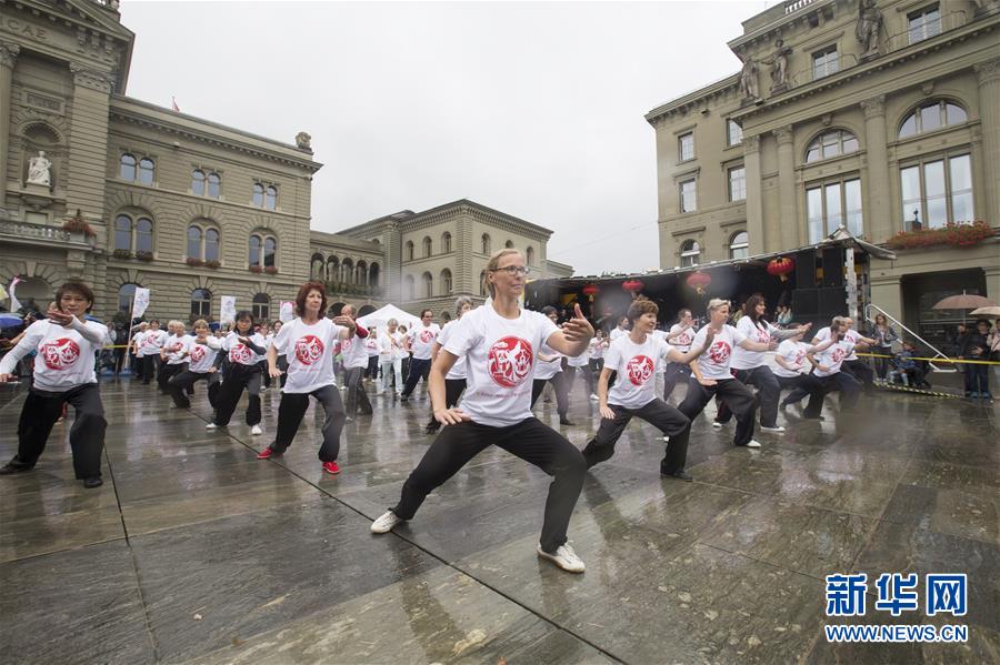 9月1日,在瑞士伯尔尼市中心的联邦广场,太极拳爱好者进行表演。 当日,一场名为“遇见中国”的大型中国文化宣传推广活动在伯尔尼市中心的联邦广场举行,来自中国的舞龙、武术、民乐、书法等精彩表演让瑞士民众近距离感受中华文化的魅力。 新华社记者 徐金泉 摄