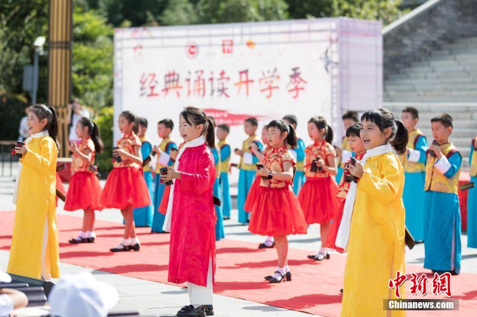 9月1日,贵阳孔学堂,小学生齐唱音乐快板《黔山学子当自强》。当日,“经典诵读开学季”活动在贵阳孔学堂举行,有400余名学子参加。活动有经典诵读、名家朗诵、说文解字、传统文化体验等公益文化活动。中新社记者 贺俊怡 摄