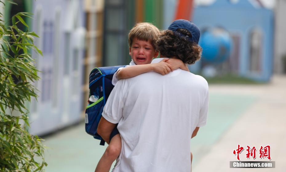 9月1日,北京市朝阳区芳草地国际学校举行开学典礼,一位外籍小学生哭着不想离开家长。当日,北京市多所中小学正式开学。中新社记者 贾天勇 摄