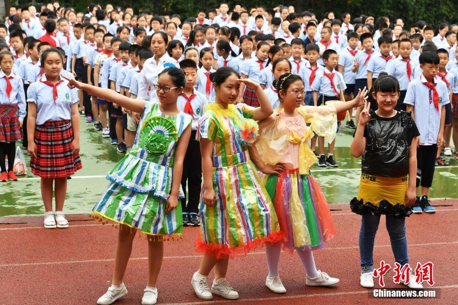9月1日,在河北石家庄石门小学的开学典礼上,由孩子们表演的“环保时装秀”,三句半“说环保”等以低碳环保为主题的节目一一亮相。图为学生们身着其用废塑料袋、纸箱等制作的“环保时装”。中新社记者 翟羽佳 摄