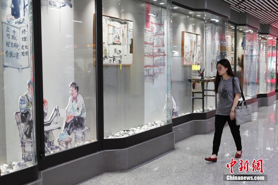 9月3日,市民在在上海地铁陕西南路站文化长廊内欣赏石库门前的市井生活。近日,在上海地铁陕西南路站文化长廊开幕的 “上海屋檐下——汪大文作品展”,让往来乘客们在水墨丹青中重温改革开放初期的上海里弄风情,感悟时代辉煌成就。中新社记者 殷立勤 摄