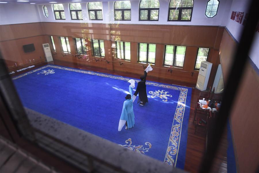 在嵊州越剧艺术学校,王洪远(右)在表演课结束后跟着老师加练水袖表演技巧(9月3日摄)。新华社记者翁忻旸 摄