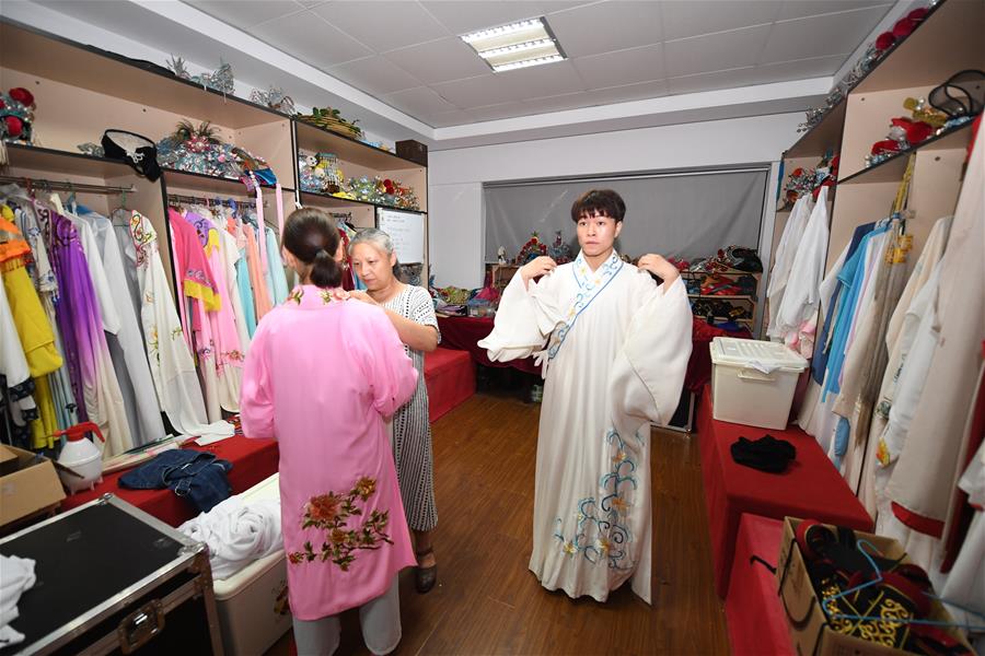 在嵊州越剧艺术学校,王洪远(右)在更衣室换上小生的服装准备跟一名女同学配戏(9月3日摄)。新华社记者翁忻旸 摄