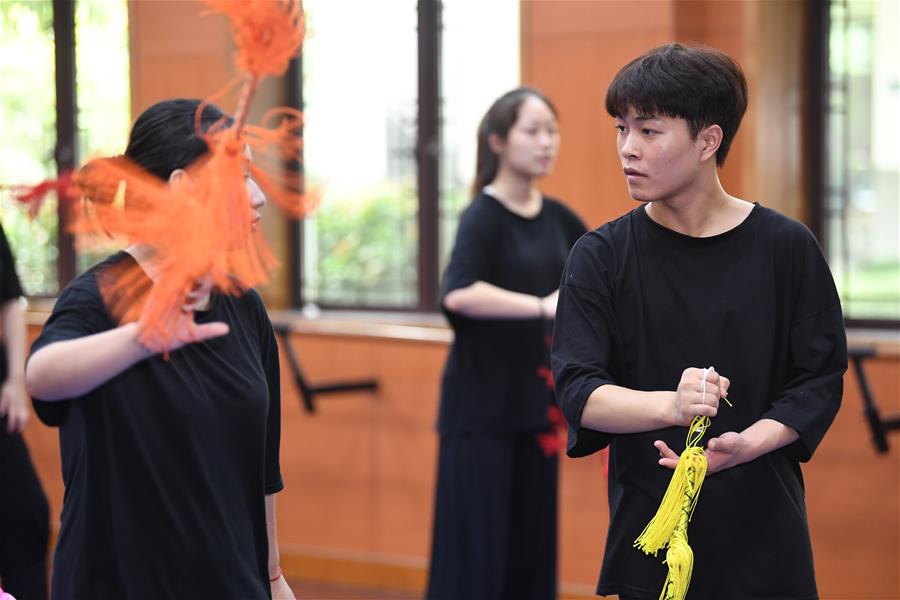 在嵊州越剧艺术学校,王洪远(前右)在表演课上跟老师学习马鞭的使用方法(9月3日摄)。新华社记者翁忻旸 摄