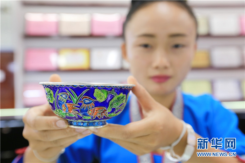 8月27日,丹寨县银饰商店的服务员向记者展示创意工艺品——景泰蓝银器。新华网 卢志佳 摄