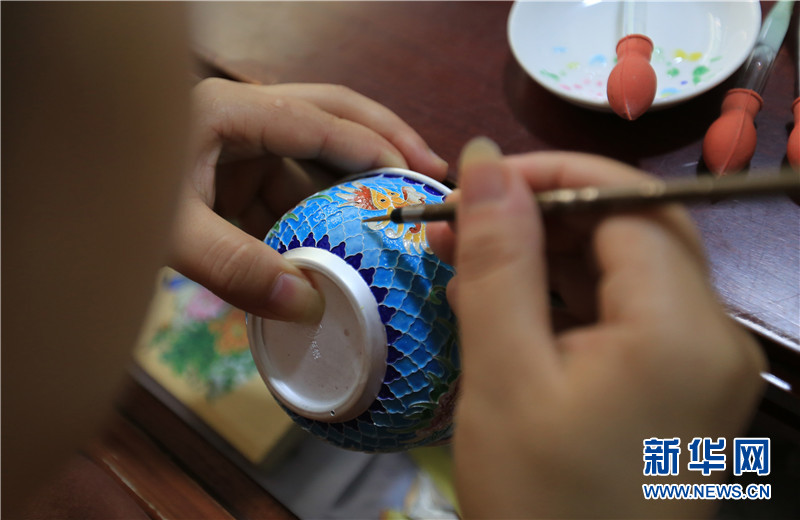 8月28日,王国春银饰工厂的工人把珐琅釉料填充到银器表面的银丝纹饰框架中。新华网 卢志佳 摄