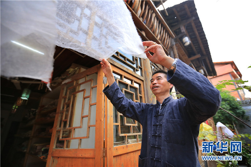 8月27日,王兴武展示薄如蝉翼的构皮纸。新华网 卢志佳 摄