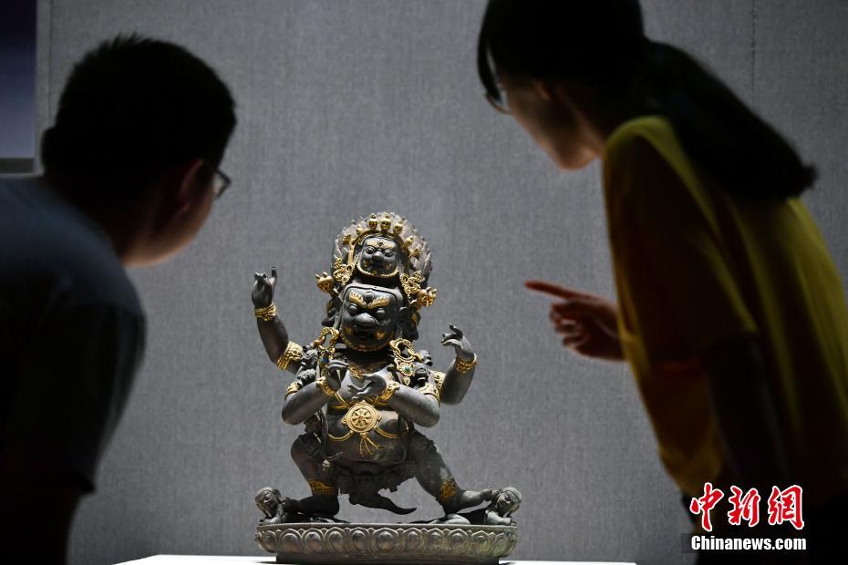 9月4日,《菩提华光——河北博物院藏铜佛造像展》在河北石家庄开展。此次约有200余尊十六国至清代的精品铜佛造像对外展出,让民众简单了解佛教及佛像之演变,并欣赏其艺术之美。图为观众参观罕见的清代“四臂大黑天”铜佛造像。中新社记者 翟羽佳 摄
