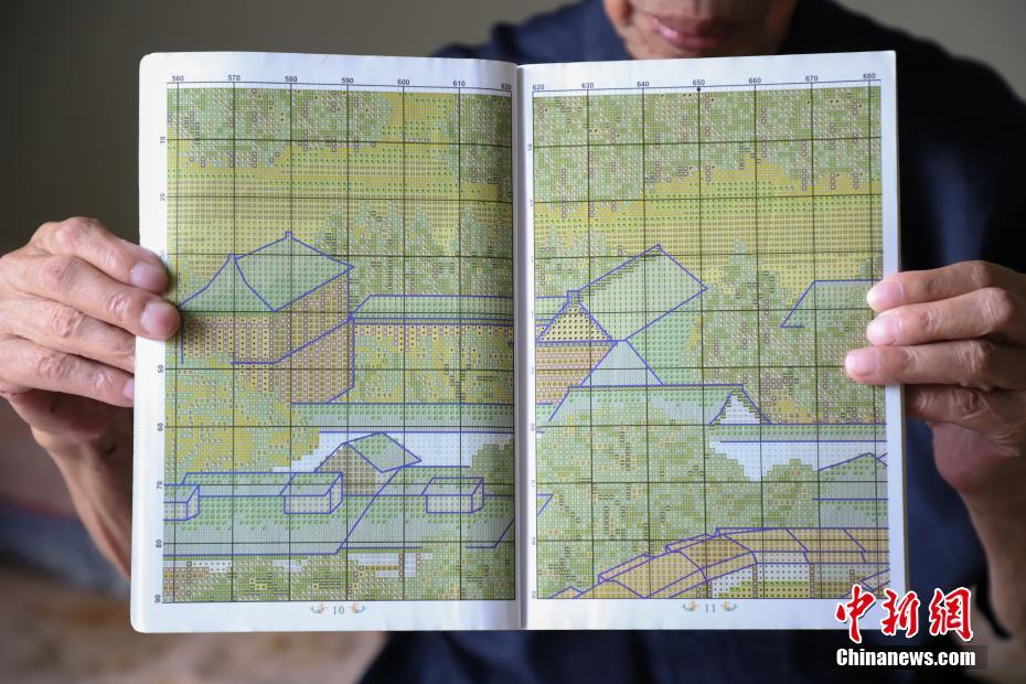 9月4日,黄肇柏展示绣制作品复杂的说明书。贵州省清镇市86岁老人黄肇柏用300余天、每天花费10余小时绣制完一幅3米长的《清明上河图》十字绣作品。中新社记者 瞿宏伦 摄