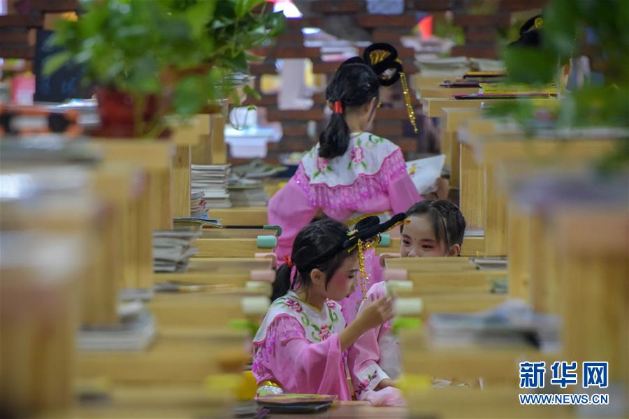 在合肥市凿壁偷光图书城,参演后的学生在阅读书籍(9月4日摄)。9月4日,安徽省合肥经开区第二届“戏曲进校园”比赛暨学校少年宫戏曲社团展演在该市凿壁偷光图书城举行,14所中小学的近200名学生登台献艺。新华社记者 郭晨 摄