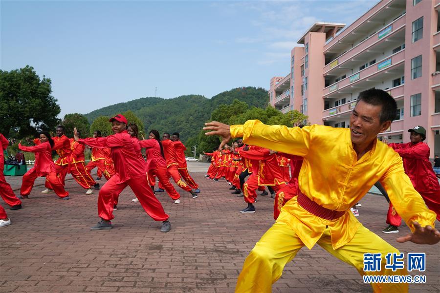 9月5日,在江西新余市渝水区人和乡辉江村,武术研习师何些口(前)和新余学院非洲留学生进行武术交流。