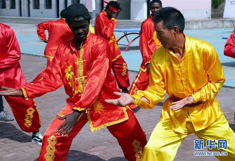 9月5日,在江西新余市渝水区人和乡辉江村,武术研习师何些口(右)和新余学院非洲留学生进行武术交流。 新华社记者宋振平摄