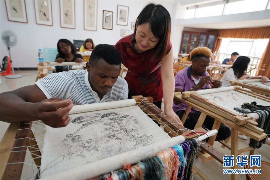 9月5日,在新余市新余学院,夏布绣工作室老师傅爱香在指导非洲留学生艾波学习体验夏布绣刺绣技法。 新华社记者宋振平摄