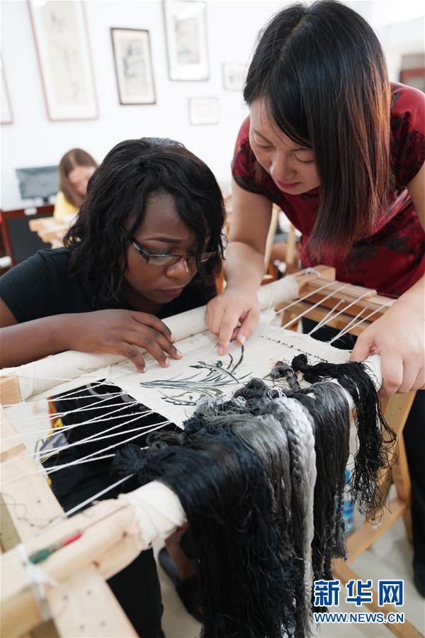 9月5日,在新余市新余学院,夏布绣工作室老师傅爱香在指导非洲留学生罗仁思学习体验夏布绣刺绣技法。 新华社记者宋振平摄