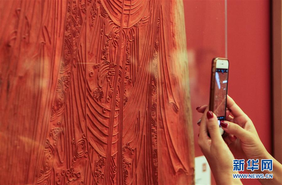 9月5日,观众在展览上拍摄一块展出的雕版。新华社记者 吕迅 摄