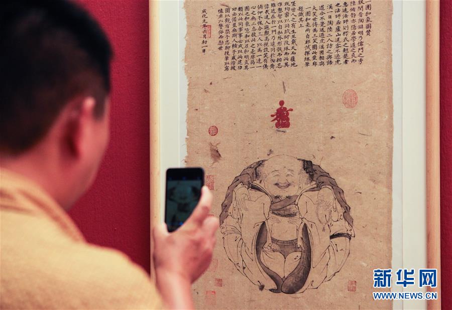 9月5日,观众在展览上拍摄木版水印艺术作品《一团和气》。新华社记者 吕迅 摄