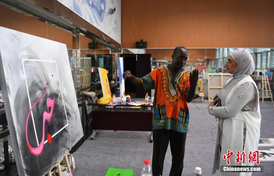 9月6日,两位阿拉伯的艺术家正在探讨作品。当日,11位来自阿拉伯的艺术家在浙江杭州进行采风创作,将对中国文化的理解和感受融于美术作品中,展现文化的融合。中新社记者 王刚 摄