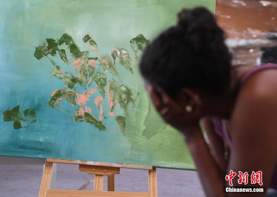 9月6日,一位艺术家在自己的作品前沉思。当日,11位来自阿拉伯的艺术家在浙江杭州进行采风创作,将对中国文化的理解和感受融于美术作品中,展现文化的融合。中新社记者 王刚 摄