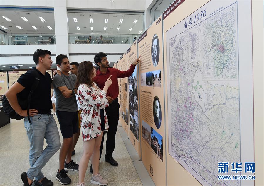 9月6日,几名外国留学生在参观展览。 当日,“穿越历史 共读南京——南京十朝历史文化高校巡展”首站展览在南京航空航天大学图书馆举行。展览用展板、图片、文献、文物和书籍等资料向高校师生展示南京2500年建城史及历史文化成就。 新华社记者 孙参摄