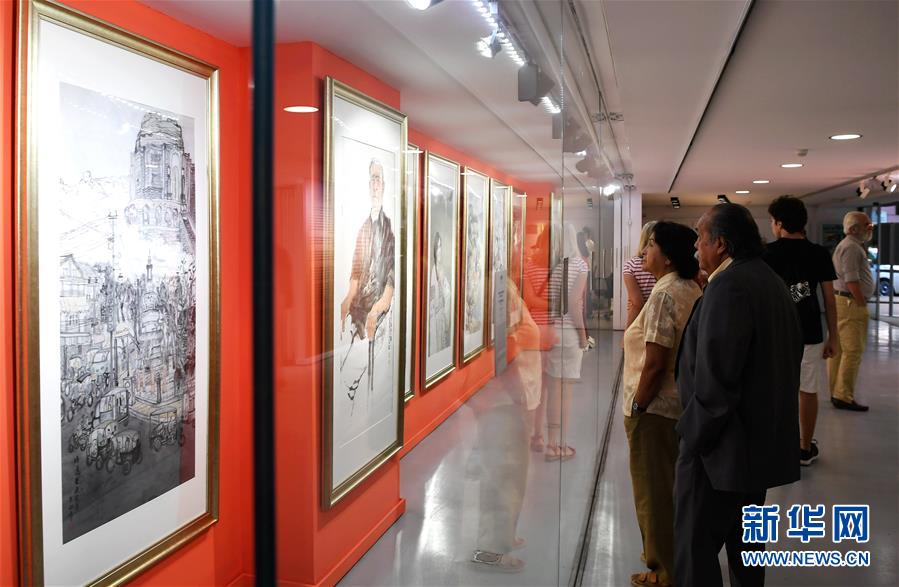 9月5日,观众在西班牙马德里中国文化中心参观“艺术与和平——中国当代美术作品展”。新华社记者郭求达摄