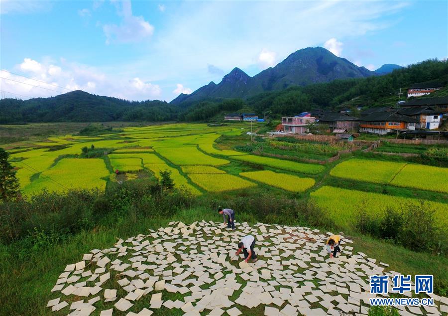 9月5日,在广西龙胜各族自治县龙胜镇大坪塘瑶寨,人们在晾晒制成的手工土纸(无人机拍摄)。