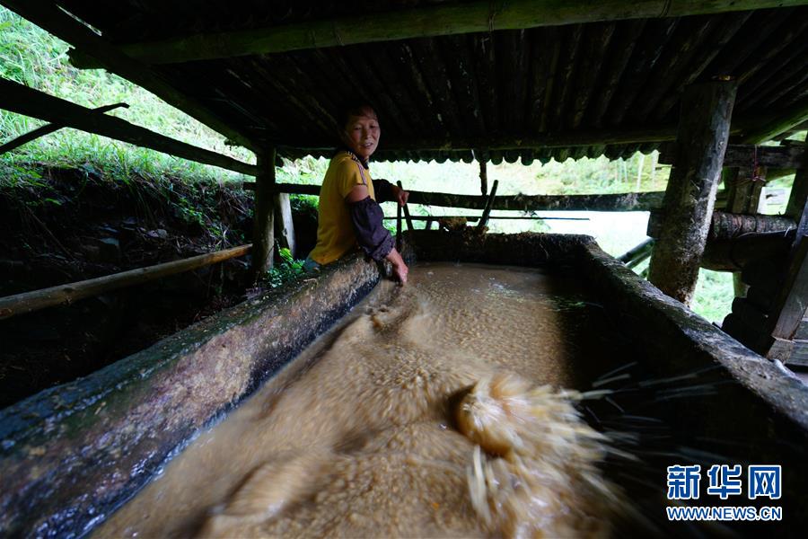9月5日,在广西龙胜各族自治县龙胜镇大坪塘瑶寨,造纸艺人黄方杰的妻子黄美英将粉碎过滤后的造纸原料放入纸浆池内搅匀。 新华社发(黄勇丹 摄)