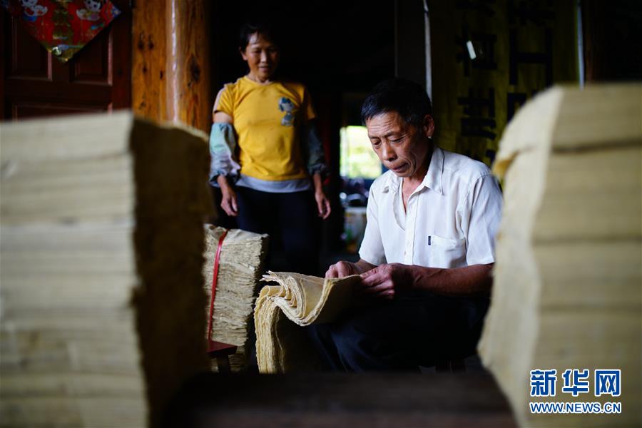 9月6日,在广西龙胜各族自治县龙胜镇大坪塘瑶寨,造纸艺人黄方杰在整理切好的手工土纸。 新华社发(黄勇丹 摄)