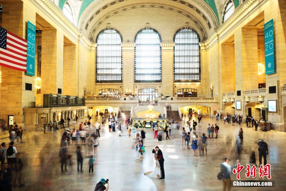 当地时间9月6日,一对亚裔新人在纽约中央车站拍摄婚纱照片,引得路人注目。中新社记者 廖攀 摄