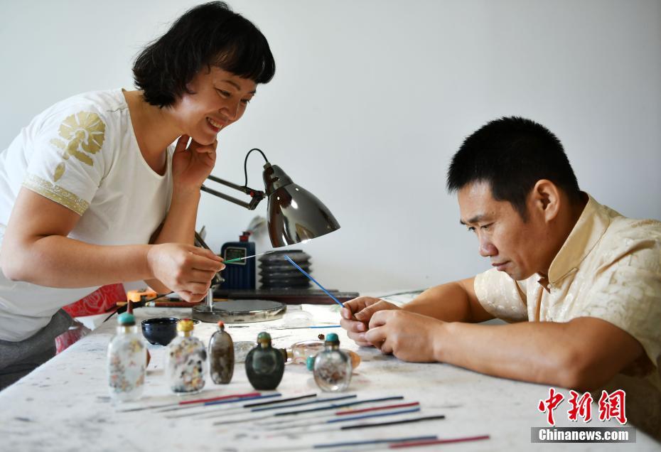 9月7日,姜文春与妻子。河北衡水内画艺人姜文春能在指甲大小的鼻烟壶内壁上画出100只姿态各异的飞禽走兽,技巧精妙。日前,姜文春再次挑战极限,创作了新品《孔子讲学》、《百鸟朝凤》和《百骏图》。其中,《孔子讲学》在直径1.26cm壶内绘了108位古代人物;《百鸟朝凤》在画面宽1.1cm、高1.15cm的鼻烟壶内画了167只活灵活现的鸟类;《百骏图》则在宽1.1cm、高1.05cm壶内画了百匹骏马。中新社记者 翟羽佳 摄