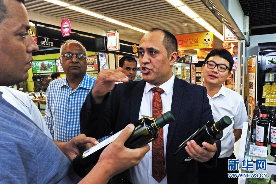 在义乌国际商贸城进口商品馆,阿马尔(右二)和客商讨论中东地区橄榄油的销售行情(9月7日摄)。 新华社记者 谭进 摄