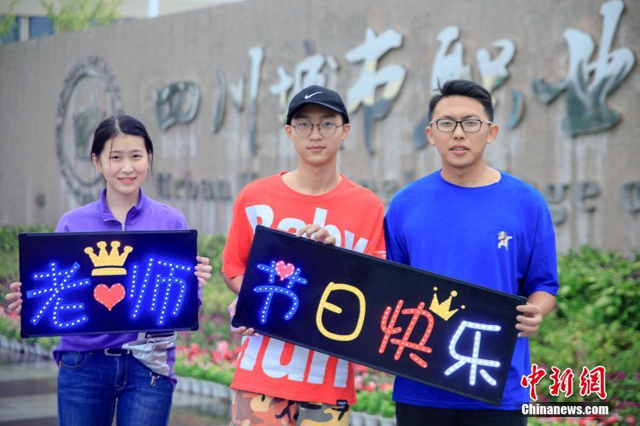 9月9日,四川眉山,大学生举着写有“老师 节日快乐”字样,祝福老师。第34个教师节前夕,四川城市职业学院大一新生为感谢老师们的辛勤工作,在校园里摆出“老师,您好!”、“向老师致敬!”等字样,祝福老师并为老师们“亮灯”。 中新社记者 刘忠俊 摄