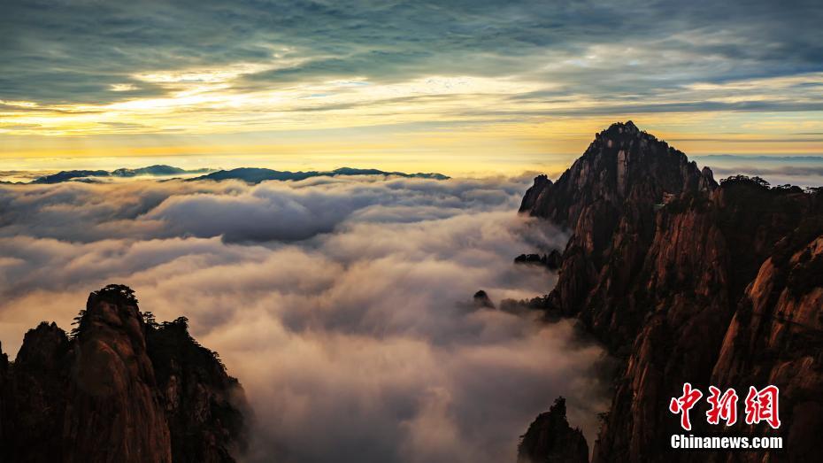 9月13日晨,安徽黄山风景区诸峰为云雾环绕,时隐时现。登高望远,莲花峰、天都峰,以及西海群峰被白白厚厚的云层包裹,形态奇美的黄山松,青褐色的山石与云海交相映衬,把黄山装扮得宛如水墨画卷。图/文 刘浩 叶永清