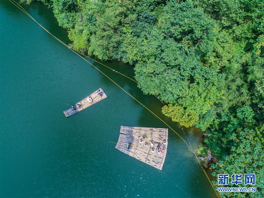 9月13日,紫荆村的演奏者在竹排上演奏竹笛(无人机拍摄)。 新华社记者 徐昱 摄