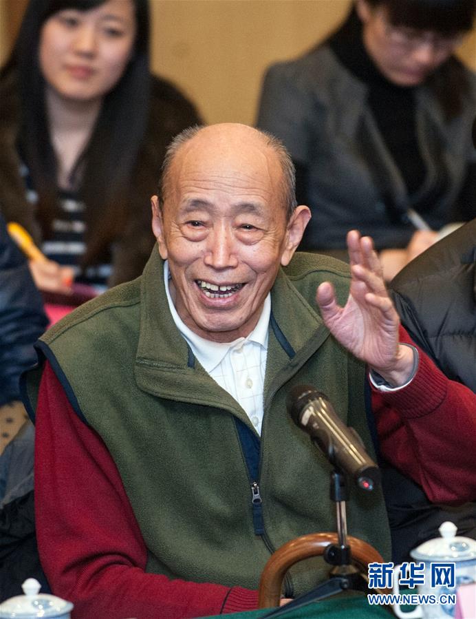 表演艺术家朱旭发表参加《甲子园》演出的感想(2013年3月25日摄)。 新华社记者 张宇摄