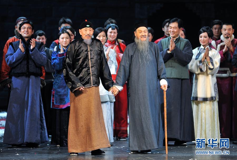 由北京人艺重排的话剧《家》在首都剧场上演,表演艺术家朱旭(前左)和演员们一起谢幕(2011年6月23日摄)。 新华社发(李晏摄)