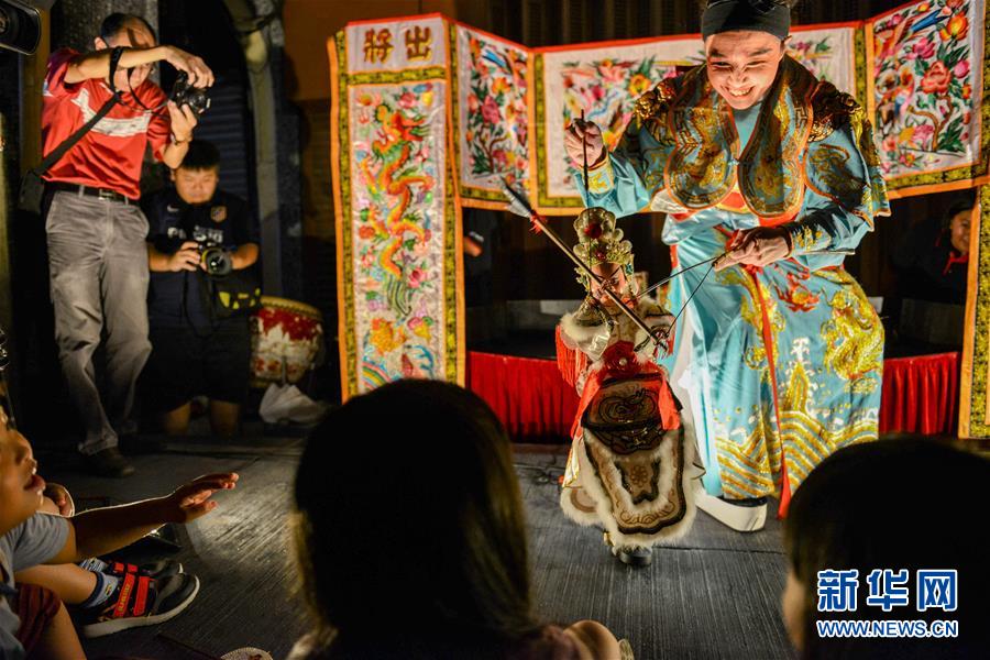 9月15日,在马来西亚吉隆坡茨厂街,人们观看木偶戏表演。