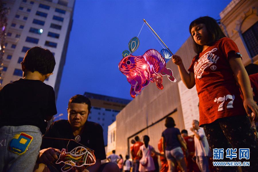 9月15日,在马来西亚吉隆坡茨厂街,一名儿童手提灯笼参加“老街走月”庆中秋活动。 新华社发(张纹综摄)