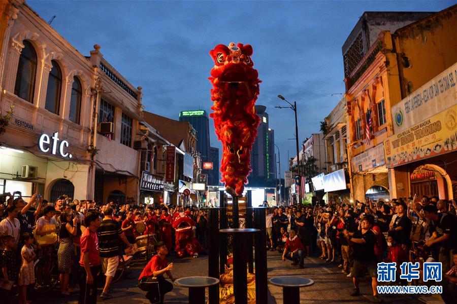 9月15日,在马来西亚吉隆坡茨厂街,人们观看高桩舞狮表演。 新华社发(张纹综摄)