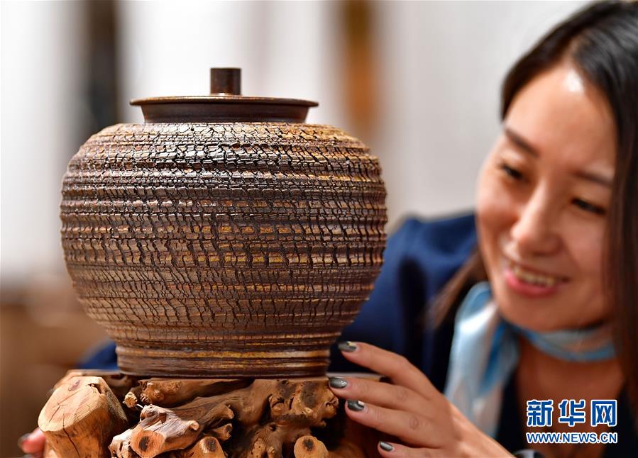9月16日,观众在第二十一届唐山中国陶瓷博览会上欣赏一件作品。 当日,第二十一届唐山中国陶瓷博览会在河北省唐山市开幕,300余家国内外陶瓷企业参展。 新华社记者 杨世尧 摄