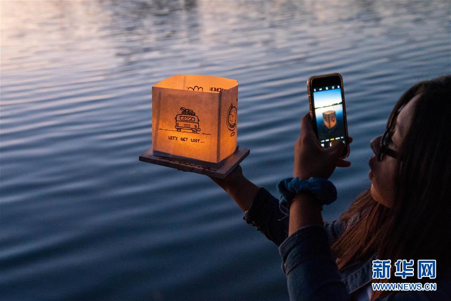 9月15日,在美国洛杉矶,一名居民在水灯节上为制作完成的水灯拍照。 当日,洛杉矶举行水灯节。人们在水灯上写下自己的心愿,真诚祈福。 新华社发(钱卫忠 摄)