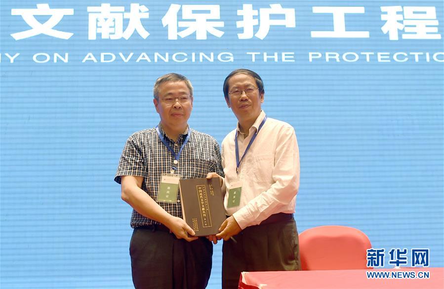 9月17日,文学卷编委会主任、北京大学博雅讲席教授陈平原(右)为本月出版的散文卷新书签名后赠送绍兴图书馆珍藏。 浙江绍兴市积极推进的近代文献保护工程经过多年前期运作,目前取得重要进展,文学卷的诗歌和散文首编本月正式出版,教育和艺术卷首编今年年内也将出版。据了解,这项工程在全球范围内搜集从1840年到1949年的中国近代文献并重新整理印刷,涉及文学、经济、政治、教育、艺术、军事等各领域,将在8至10年内完成。 新华社记者 韩传号 摄