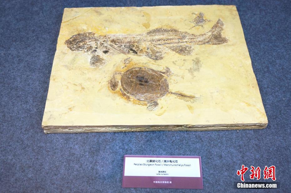 此次特展中展出的北票鲟化石(上)和满洲龟化石(下)。韩章云 摄