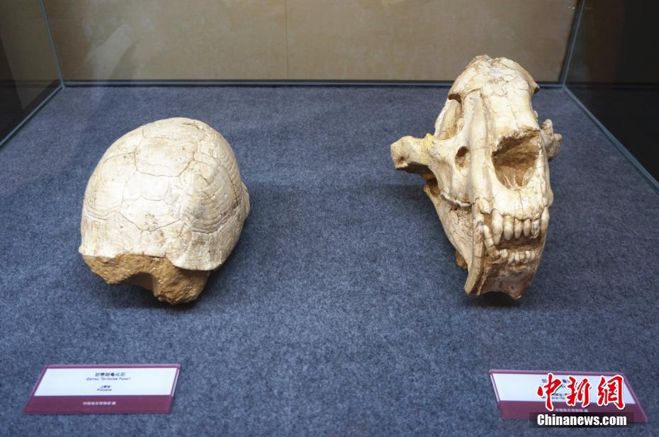 此次特展中展出的甘肃陆龟化石(左)和剑齿虎头骨化石(右)。韩章云 摄