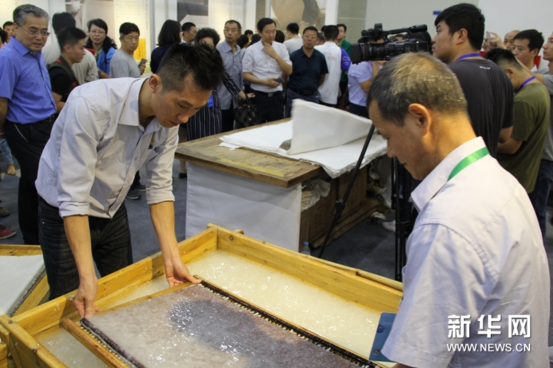 9月13日至17日,第五届中国非物质文化遗产博览会在山东济南举行。主展馆内,传承人在向观众展示安徽省泾县宣纸制作技艺。新华网 邢贺扬摄