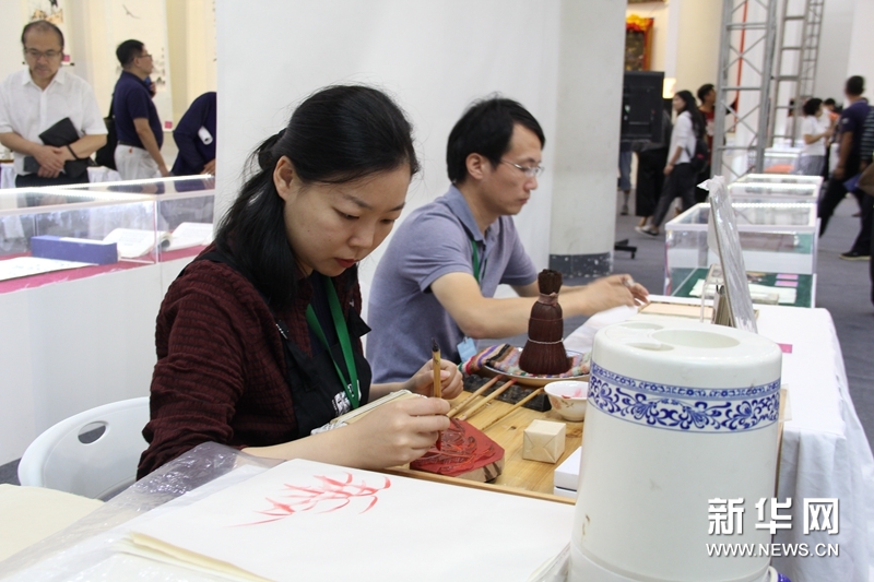 9月13日至17日,第五届中国非物质文化遗产博览会在山东济南举行。主展馆内,传承人在向观众展示朵云轩木版水印技艺。新华网 邢贺扬摄
