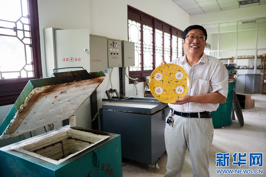 经过最后一次烤制,景德镇陶瓷大学教授、江西省陶瓷企业信息化工程技术研究中心主任章义来取出成品。章教授介绍,瓷盘的创意源于朋友圈一位77级的老学友“晒”录取通知书。很多老同学留言录取通知书早已丢失,实在遗憾。于是章义来教授提出,设计一个陶瓷纪念瓷盘,给入学新生一个永久纪念。(新华网发 吴百强 摄)